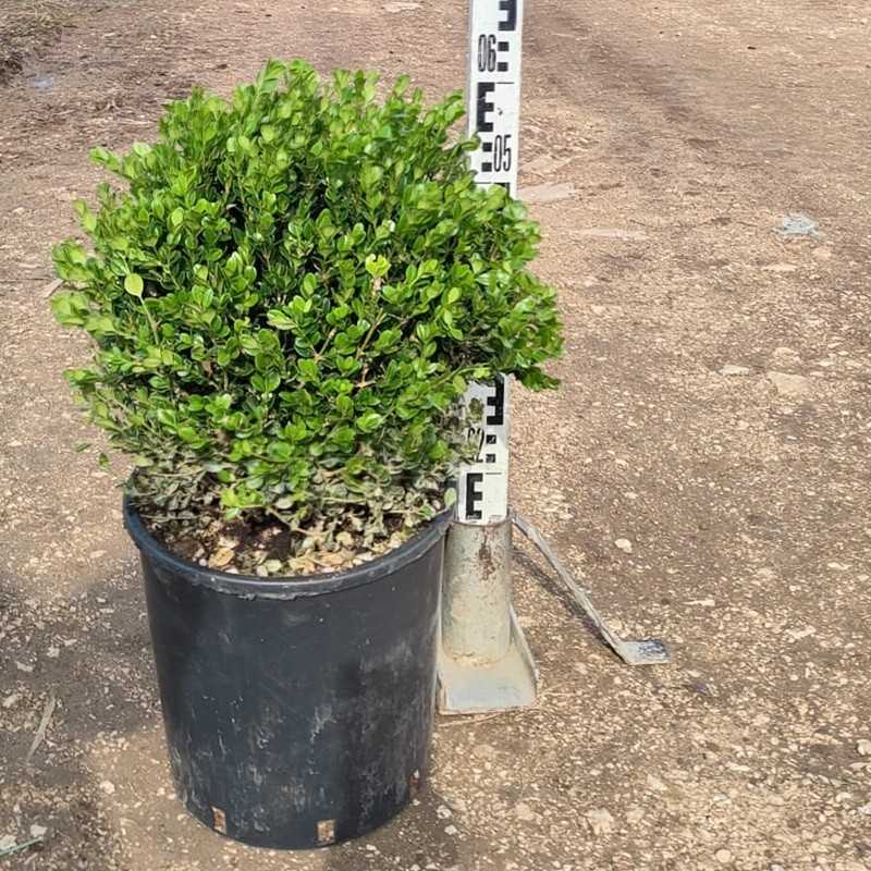 Le foglie sono piccole, coriacee e di un verde brillante, mantenendo il loro colore anche nei mesi invernali. Il fogliame è fitto e denso, qualità che rende il bosso perfetto per creare elementi topiari, bordure o per essere utilizzato come pianta singola decorativa in giardino o in vaso. La crescita è lenta ma costante, con un portamento naturalmente compatto che richiede poca manutenzione.